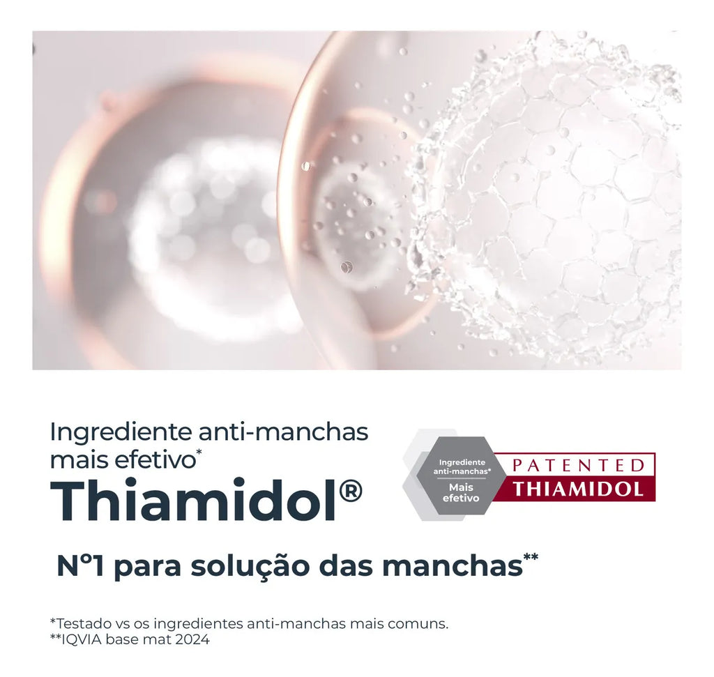 🧬 Thiamidol Patenteado: Age na raiz da hiperpigmentação, reduzindo manchas de sol e melasma em 2 semanas.